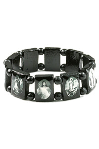 Black wood religious bracelets with b&w saints images. 10 wood panels mounted on stretchable strings. Adult size.