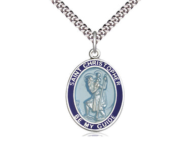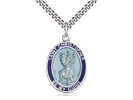 Sterling Silver St. Christopher Blue Border Pendan Necklace 1 x 3/4 - 24 Inch Chain