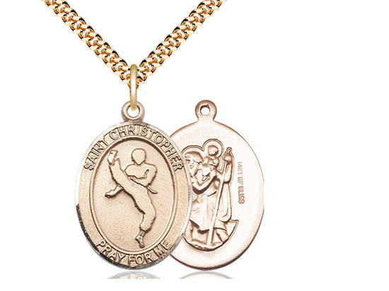 Embrace your faith with timeless elegance. This exquisite Gold Filled Saint Christopher/Martial Arts Necklace, measuring 1 x 3/4, is meticulously handcrafted in the USA by Bliss, a renowned name in religious jewelry. The durable 24-inch Gold Filled curb chain gracefully drapes with a secure lobster clasp for a comfortable, everyday wear. The is a patron saint of travelers, motorists.