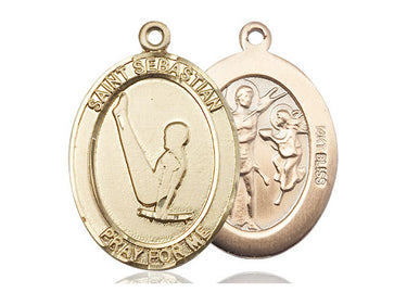 Embrace your faith with timeless elegance. This exquisite 14KT Gold Saint Sebastian/Gymnastics Pendant, measuring 1 x 3/4, is meticulously handcrafted in the USA by Bliss, a renowned name in religious jewelry. The durable -inch 14KT Gold curb chain gracefully drapes with a secure lobster clasp for a comfortable, everyday wear. The is a patron saint of athletes, soldiers.