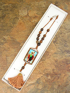 One decade rosary from brazil. Features st. Christopher image and one decade wood bead rosary. Length: 9".