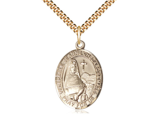 Embrace your faith with timeless elegance. This exquisite Gold Filled Jeanne Chezard de Matel Necklace, measuring 1 x 3/4, is meticulously handcrafted in the USA by Bliss, a renowned name in religious jewelry. The durable 24-inch Gold Filled curb chain gracefully drapes with a secure lobster clasp for a comfortable, everyday wear.