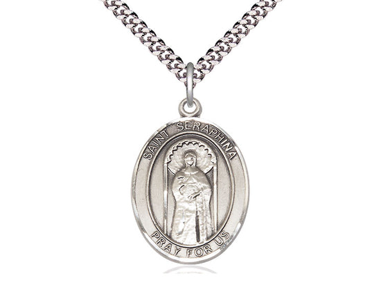 Embrace your faith with timeless elegance. This exquisite Sterling Silver Saint Seraphina Necklace, measuring 1 x 3/4, is meticulously handcrafted in the USA by Bliss, a renowned name in religious jewelry. The durable 24-inch Sterling Silver curb chain gracefully drapes with a secure lobster clasp for a comfortable, everyday wear. The Saint Seraphina is a patron saint of handicapped, disabled.