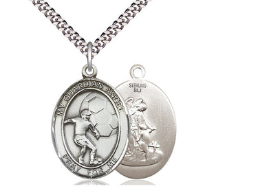 Sterling Silver Guardian Angel/Soccer Pendant Necklace 1 x 3/4 - 24 Inch Chain