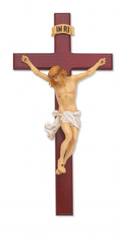 15" tall cherry stained wall crucifix. Comes in a gift box.