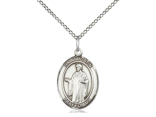 Sterling Silver St. Justin Pendant Necklace 3/4 x 1/2 - 18 Inch Chain