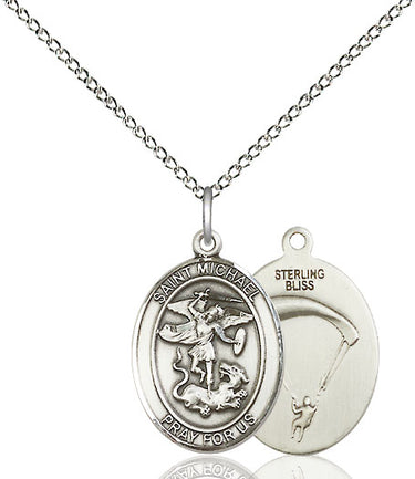Embrace your faith with timeless elegance. This exquisite Sterling Silver Saint Michael / Paratrooper Necklace, measuring 3/4 x 1/2, is meticulously handcrafted in the USA by Bliss, a renowned name in religious jewelry. The durable 18-inch Sterling Silver curb chain gracefully drapes with a secure lobster clasp for a comfortable, everyday wear.