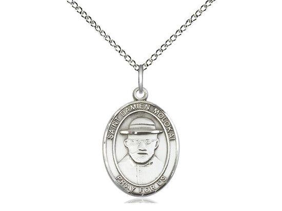 Sterling Silver St. Damien of Molokai Pendant Necklace 3/4 x 1/2 - 18 Inch Chain