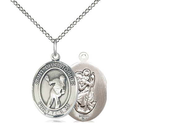 Embrace your faith with timeless elegance. This exquisite Sterling Silver Saint Christopher/Lacrosse Necklace, measuring 3/4 x 1/2, is meticulously handcrafted in the USA by Bliss, a renowned name in religious jewelry. The durable 18-inch Sterling Silver curb chain gracefully drapes with a secure lobster clasp for a comfortable, everyday wear. The is a patron saint of travelers, motorists.