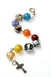 Beautiful religious bracelet with glass beads. Bead sizes: 10mm-15mm. Total length: 9". Lobster claw.
