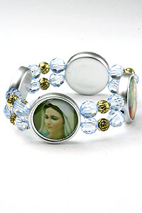 Seven round panel bracelet with religious images. Adult size. Each panel diameter: 0. 75". Mounted on stretchable string.