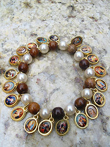 Beautiful stretchable bracelet with golden tone mary medallions. Wood and faux pearl beads mounted on string. Imported from brazil.