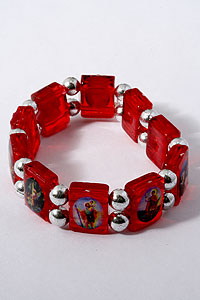 Stretchable bracelet with 10 red acrylic squares and two rows of silver tone beads.