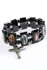 Magnetic, shiny black hematite religious bracelet with a crucifix mounted on a stretchable string. Very nice finish. Each panel is. 375" x. 500".