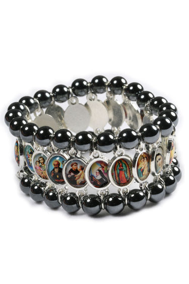 This stunning double row Catholic bracelet features polished 5mm black hematite beads paired with sacred religious medals. The dual-strand design creates visual depth while the hematite beads provide a lustrous, metallic finish that complements any outfit. Each religious medal adds spiritual significance, making this more than just jewelry—it's a wearable expression of faith.
