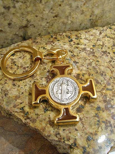 Gold Tone St Benedict Catholic Keychain | Brown Enamel | Italian Crafted