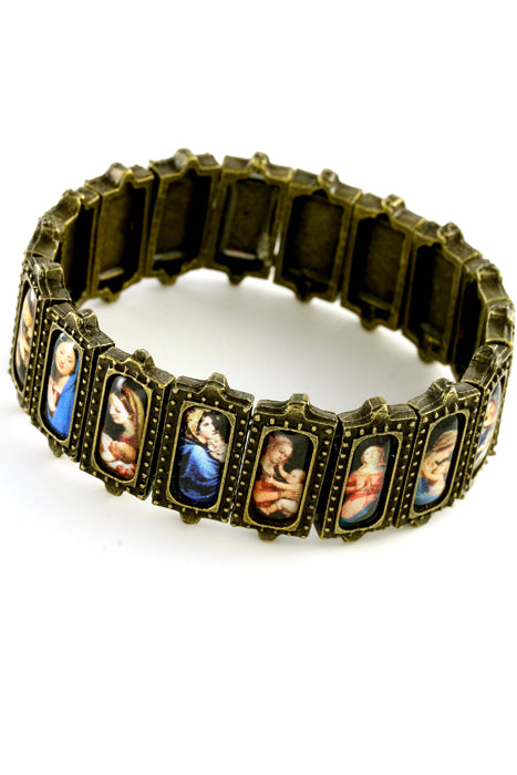 Antique gold finish catholic bracelet with images of mary and child. There are 18 metal panels mounted on a stretchable string. Each panel measures 0. 750"x0. 375" and features an icon of virgin mary and the child. Made in brazil.