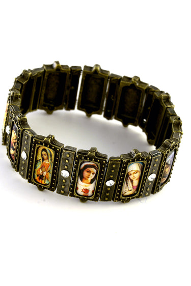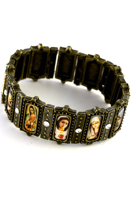stretchable brazilian saint bracelet for women. Stunning catholic bracelet with 12images of our lady in full color. The bracelet is made of base metal and features antique finish. Each panel is 0. 750" x. 375" and has a color image of mary and child. Each panel features a small icon and crystal. Limited quantity available.