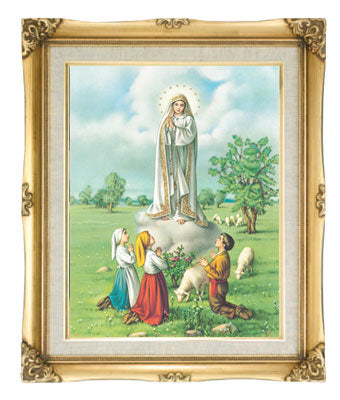 Our lady of fatima framed art overall size 16"x20". Authentic reproduction from the originals of adolfo simeone. 13"x16" linen print set in a 2" antique gold wood frame with a linen liner. Gift boxed. Glass not included.