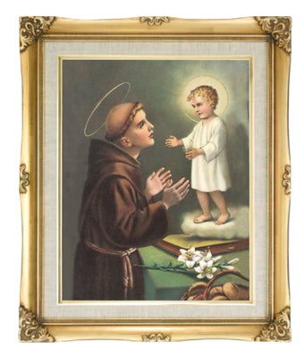 Anthony of padua framed art overall size 16"x20". Authentic reproduction from the originals of adolfo simeone. 13"x16" linen print set in a 2" antique gold wood frame with a linen liner. Gift boxed. Glass not included.