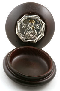 Perpetual help rosary box. Handcrafted in poland. Two piece construction. Silver plated icon on lid. External size: 3. 5" diameter. Fits 5 decade rosary up to 12mm beads.
