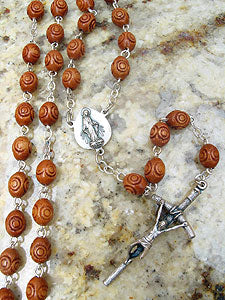 Length: 20". Rosary Features 7mm Light Brown Carved Oval Wooden Beads with Silver Tone Links, Center and 2.5" Oxidized Crucifix. Imported.