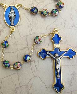 Beautiful. decorative enamelwork with metal filaments fused to the surface of each glass bead filled in with enamel paste. The rosary features golden tone links. Our Lady of Miraculous Medal Center in Blue Enamel. The 2.5" Crucifix with Silver Tone Corpus in Blue Enamel. Length: 21"