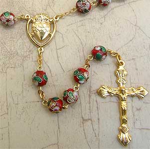 Red Cloisonne beads with Golden Heart Center and Gold-tone Crucifix. Golden tone links. Very Unique.