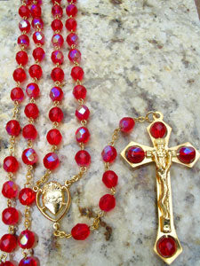 Unique Red Glass Bead Rosary. Golden Tone Links, Center, and Crucifix with Spinner Beads. Length: 21.5". Boxed.