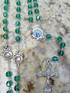 Miraculous Medal Rosary with Emerald Green Glass Beads. Silver Tone Links, MM Center, and Crucifix. Length: 18"