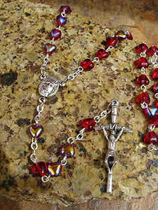 Length: 13.5". Iridescent Red Glass Heart Bead Rosary. Silver tone links, center and papal crucifix. The center features Virgin Mary on one side and Jesus in Crown of Thorns on the other. Imported from Italy.