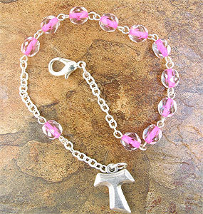 Rssb91 silver tone bracelet with pink string glass beads. Lobster claw clasp. Tau cross. Length: 8".