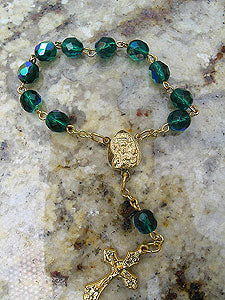Emerald green glass one decade rosary. Golden tone links, center and crucifix. Imported from italy.