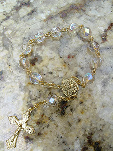 Clear glass with yellow tint 1 decade rosary. Golden tone links, center and crucifix. Imported from italy.