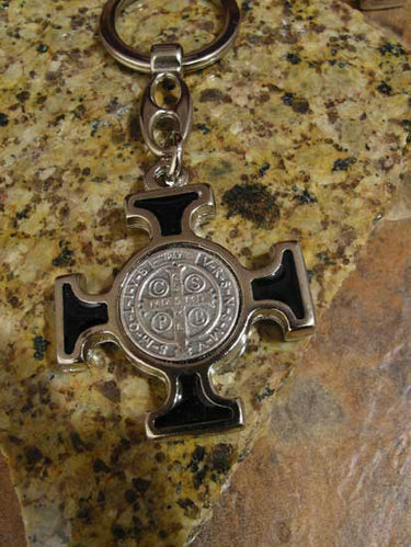 Silver Tone St Benedict Catholic Keychain with Black Enamel