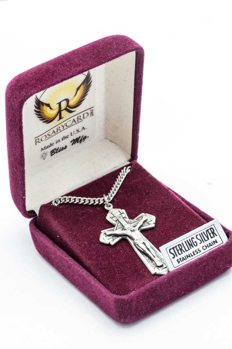 Express your faith with this stunning large sterling silver crucifix necklace. The 1 5/8" x 7/8" pendant showcases exceptional detail and traditional Catholic iconography, paired with a 24-inch sterling silver curb chain for a complete, ready-to-wear piece. Handcrafted in the USA by Bliss Manufacturing, a trusted name in Catholic religious jewelry since 1917, this crucifix necklace represents over a century of devotion to quality craftsmanship.