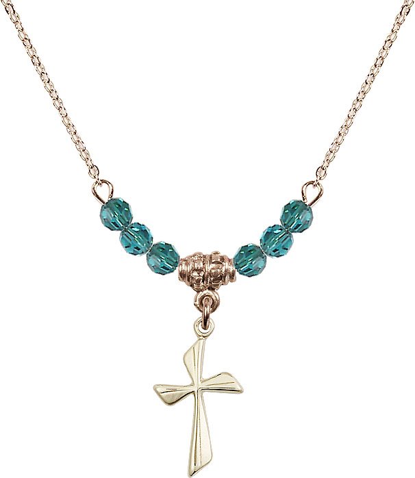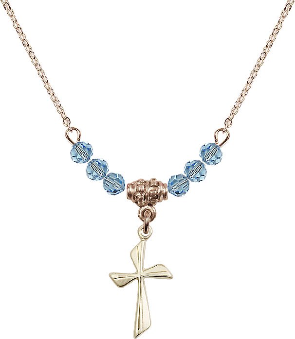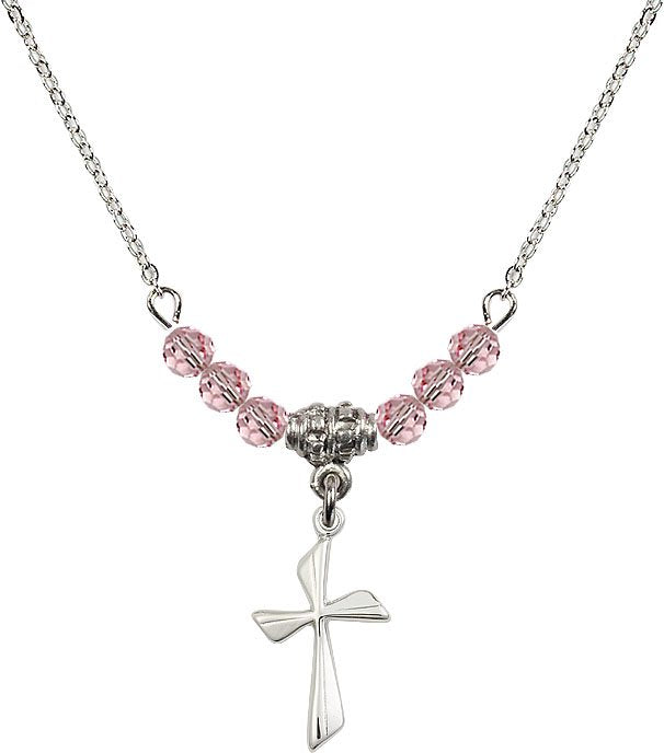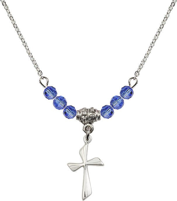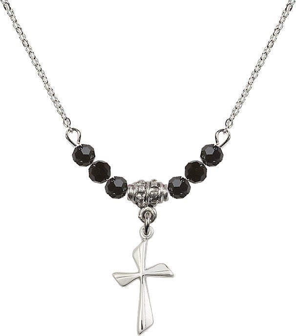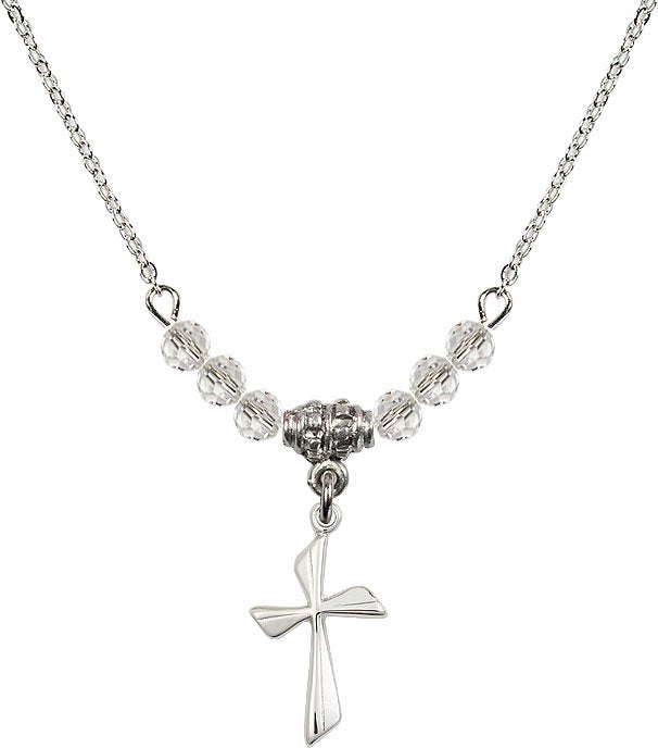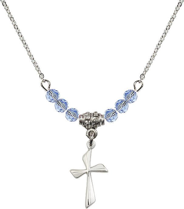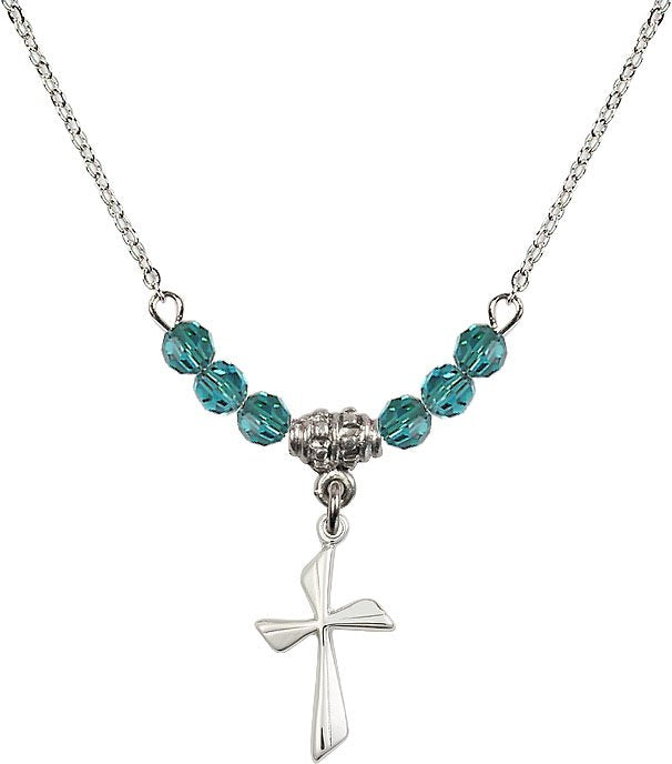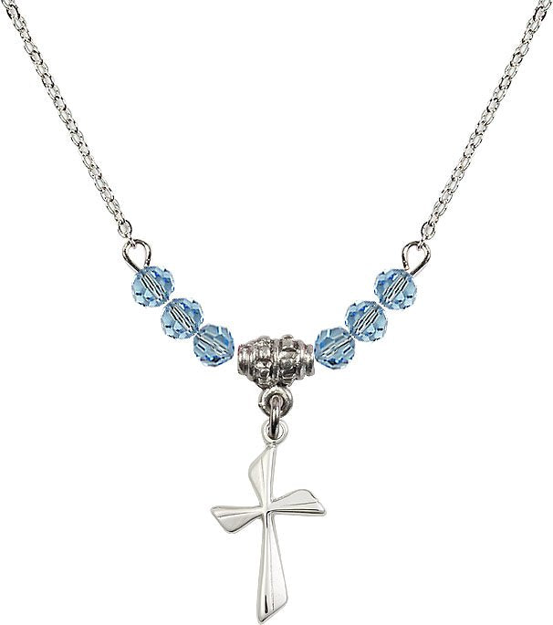 18" Rhodium Plated Necklace with 4mm Aqua Crystal Beads featuring a Sterling Silver Cross Medal.