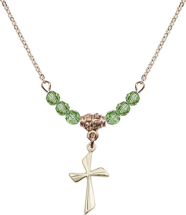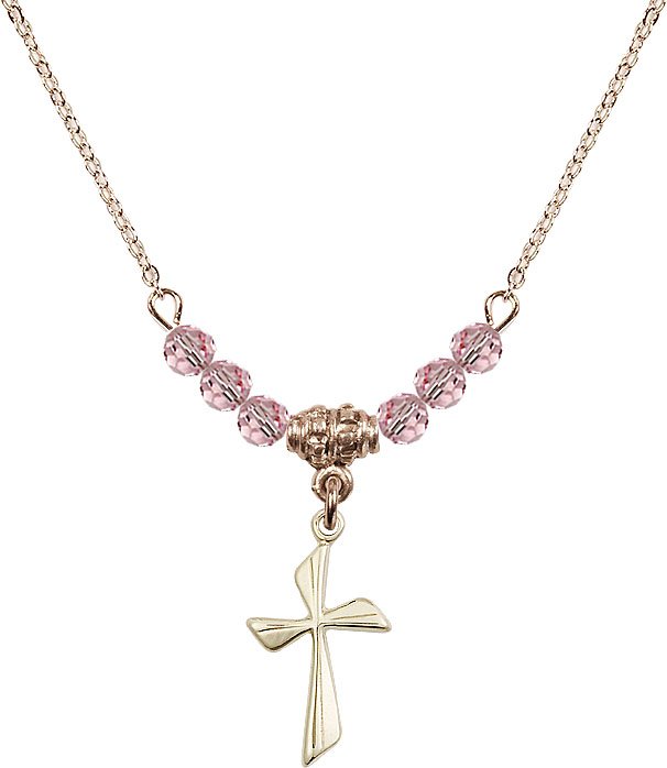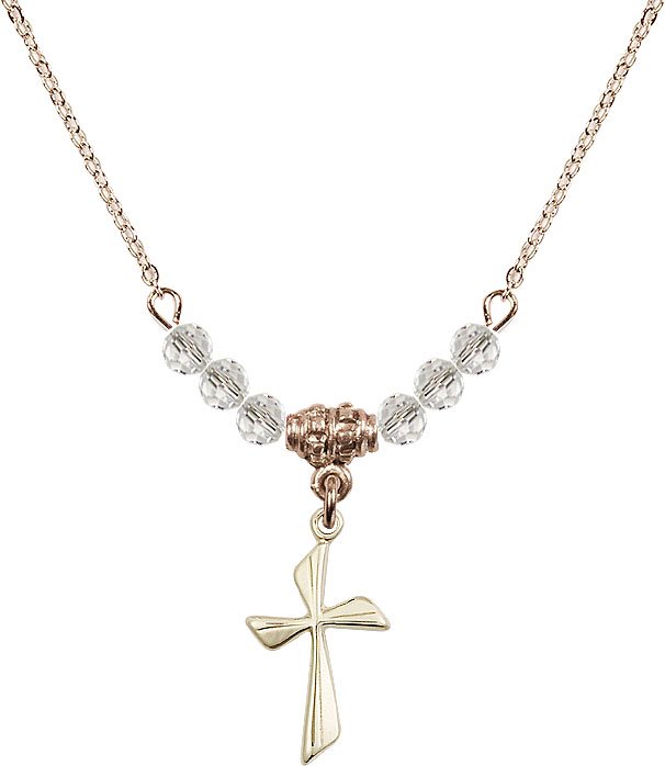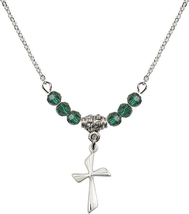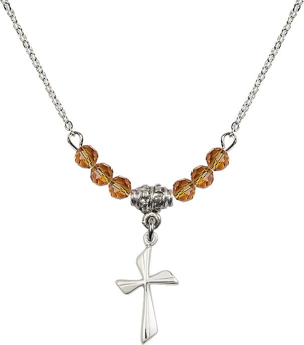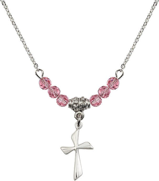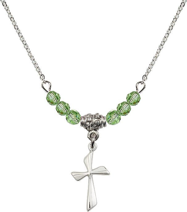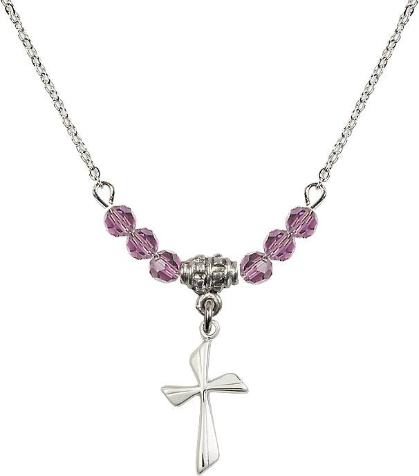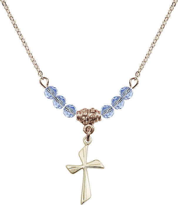 18" Rhodium Plated Necklace with 4mm Aqua Crystal Beads featuring a Sterling Silver Cross Medal.